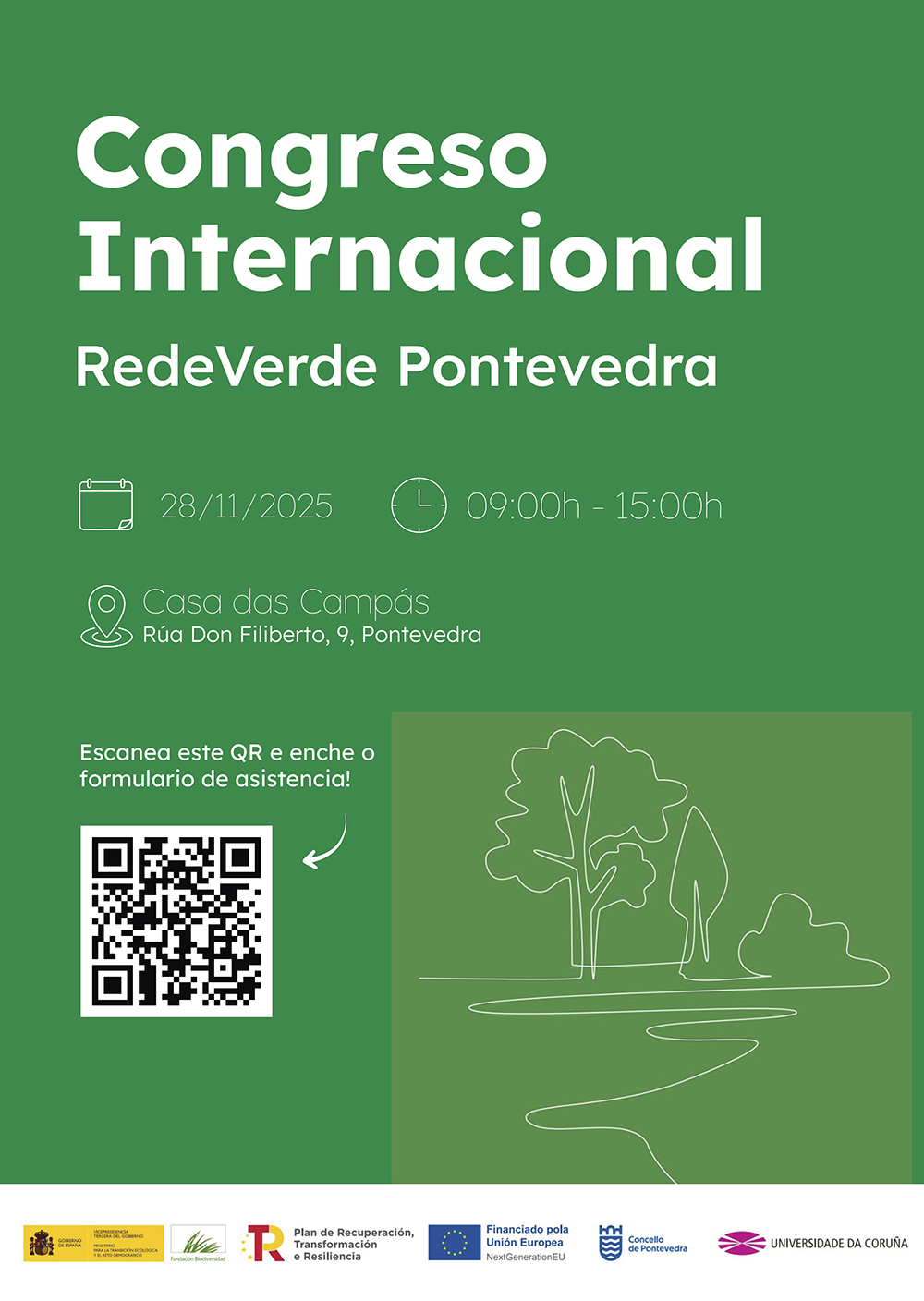 A Universidade da Coruña (UDC), en colaboración co Concello de Pontevedra, organiza o Congreso Internacional Redeverde Pontevedra, que se centrará na renaturalización das cidades e a súa adaptación ao cambio climático a través de diversas solucións baseadas na natureza. Este evento forma parte das actividades de gobernanza e participación do Proxecto Redeverde Pontevedra, que inclúen sesións de formación para técnicos e divulgación ao público sobre temas relacionados coas infraestruturas verdes. O proxecto conta co apoio da Fundación Biodiversidade do Ministerio para a Transición Ecolóxica e o Reto Demográfico (MITECO) no marco do Plan de Recuperación, Transformación e Resiliencia (PRTR), financiado polo programa Next Generation EU da Unión Europea.