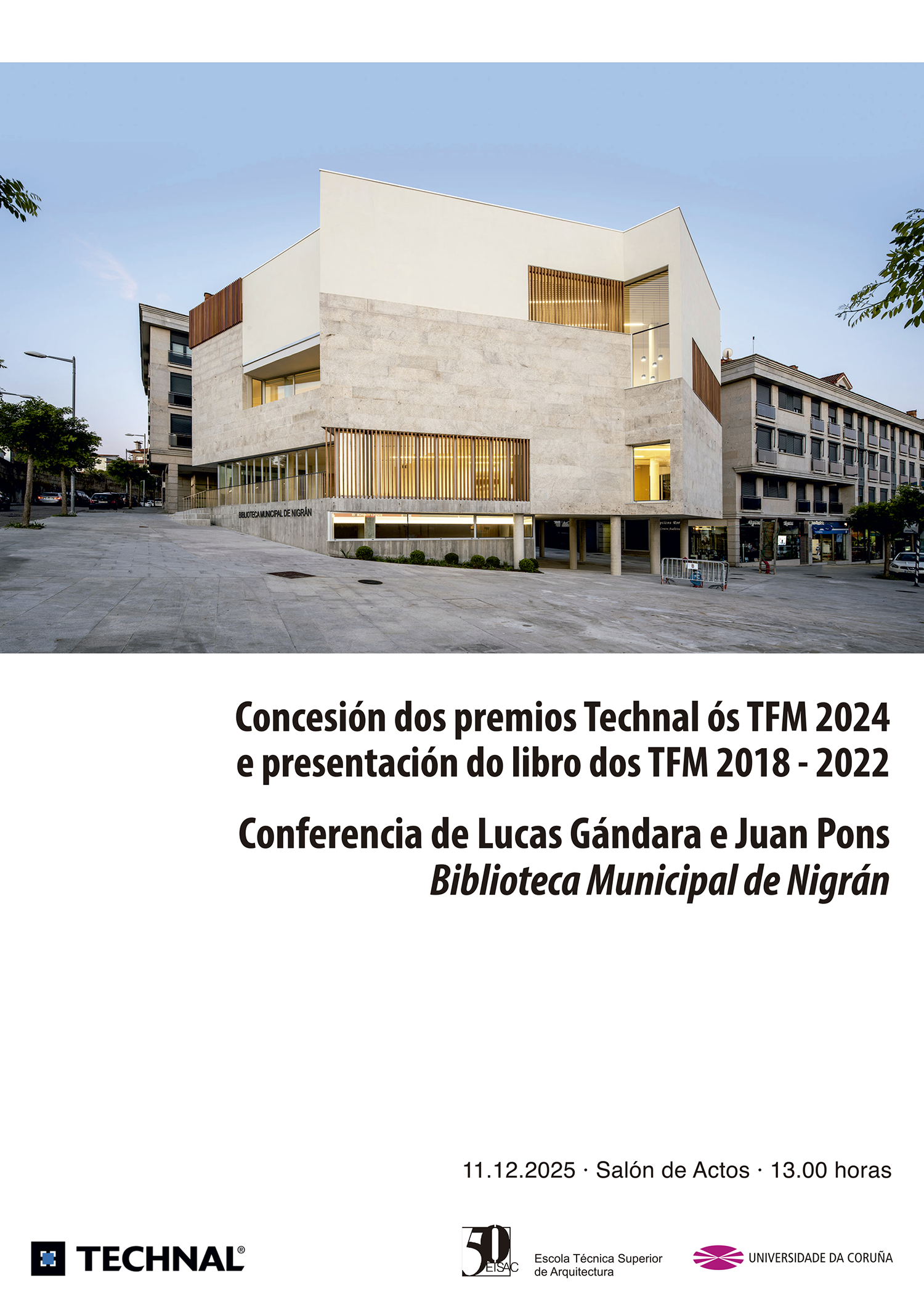 O vindeiro xoves, 11 de decembro, dentro do Espazo ETSAC, terá lugar a concesión dos premios Technal ós TFM 2024, a presentación do libro dos TFM 2018-2022 e a conferencia de Lucas Gándara e Juan Pons titulada «Biblioteca Municipal de Nigrán».